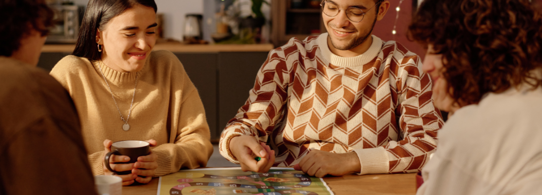 Four people sitting around a wooden table playing a colorful board game, with one person holding a game piece and another holding a green plate and a mug, in a cozy indoor setting with warm lighting.