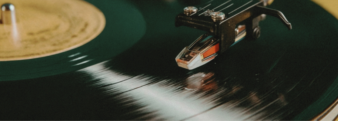 Close-up of a vinyl record spinning on a turntable, with the stylus needle positioned on the grooves of the record, highlighting the texture and details of the black vinyl and the tonearm mechanism.