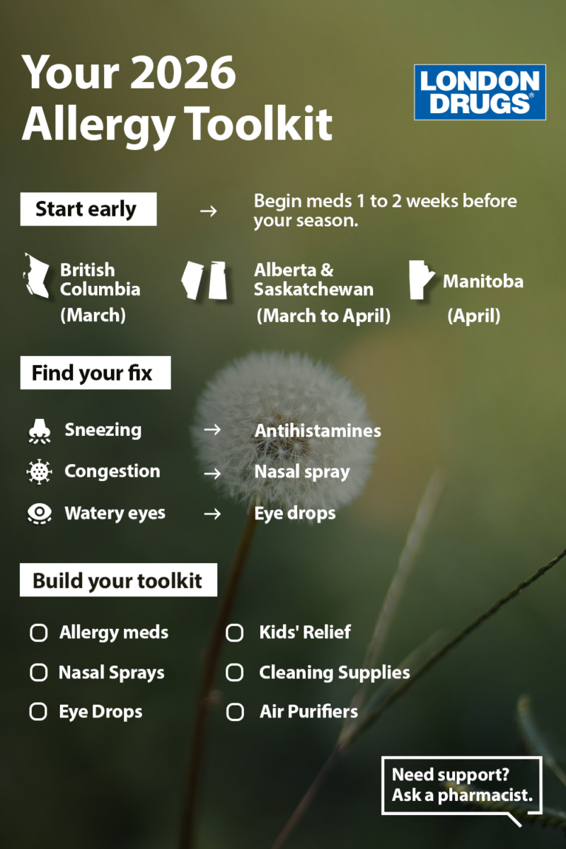 Allergy season doesn’t have to mean months of discomfort. With early preparation, the right toolkit, and support from knowledgeable pharmacists, it’s easy to reduce symptoms and enjoy the season. Shop allergy essentials at London Drugs to stock up on supplies. For additional advice, talk to a pharmacist about managing your allergy symptoms.